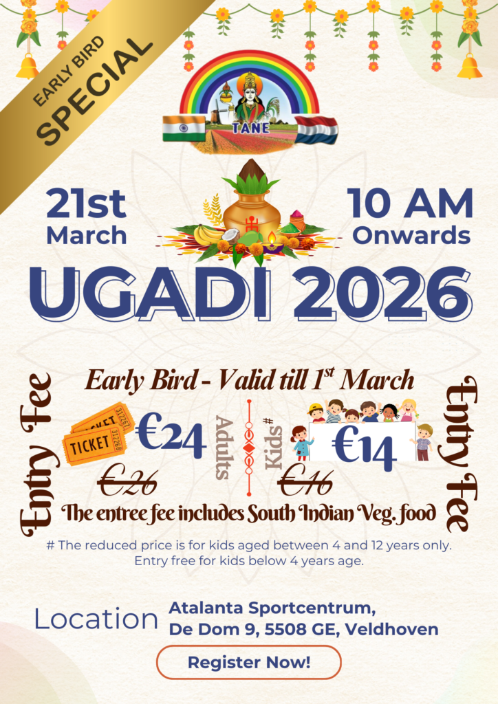Telugu Association Netherlands (TANE), a non-profit and non-political organization founded in 2012 is the first Telugu association in the Netherlands. TANE’s main objective is to create a platform for the Telugu speaking people in Netherlands to connect, socialize and celebrate by being together. TANE’s motive is to promote Telugu culture and heritage with children of the current generation who have been living away from the ‘Telugu Soil’ (తెలుగు నేల) filled with family values, spirituality, self-esteem and pride. TANE has distinguished itself through its various activities in the form of promoting Telugu culture and serving the community. Promote Telugu cultural identity through various events, activities and entertainment Celebrate Telugu Festivals offering the rich experience of Telugu authenticity and atmosphere Promote Spirituality by organizing events like Balaji Kalyanam Invite eminent Telugu singers, musicians, dancers and other eminent artists to savor the brilliance of Telugu culture. Arts to the local Dutch community Organize TANE ‘మన బడి’ to teach Telugu language to children helping them deepen bonds with their family, community, and heritage Assist in integrating with Dutch society and provide basic information like schooling, accommodation, jobs, etc for the newcomers and those who have been living in Netherlands Raise charities concerning various purposes for the social cause Serving ‘జన్మభూమి’ during any calamities by raising funds through charity Organize ‘Sports Day’ to promote healthy lifestyle and include sports in one’s daily routine.